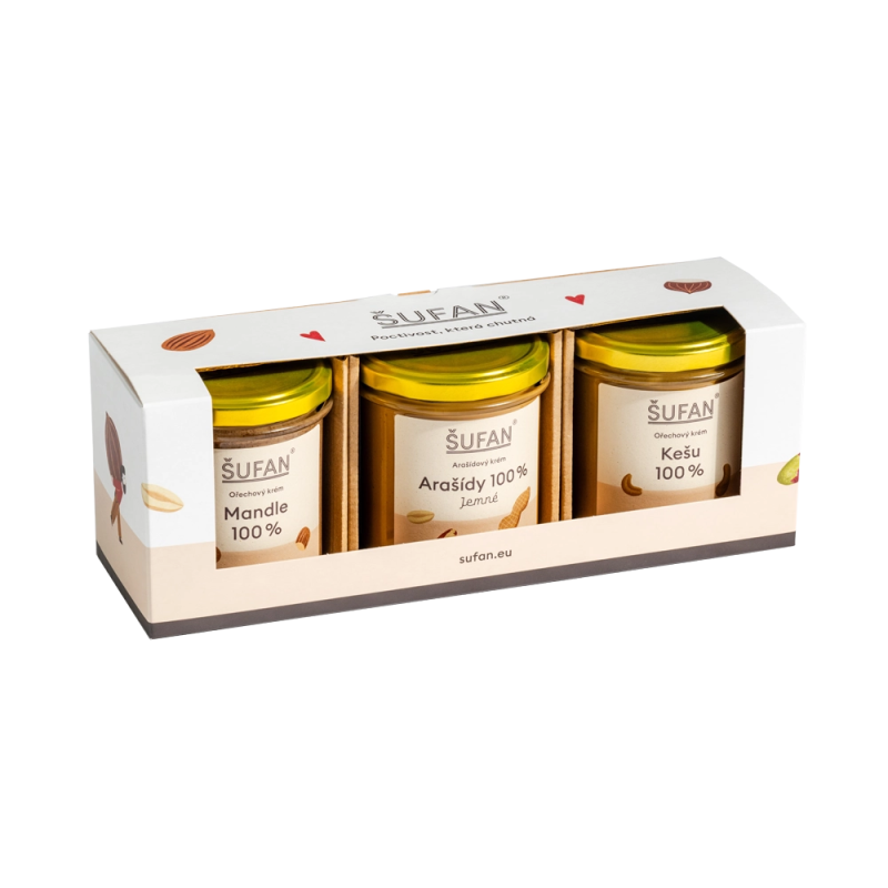 Tři skleničky čisté ořechové radosti v jednom dárkovém balení. Arašídové, mandlové a kešu – každé z nich ze 100 % ořechů, bez příměsí a bez zbytečností. Prostě tak, jak je máme nejradši. Pro všechny, kdo ocení poctivost schovanou pod víčkem.